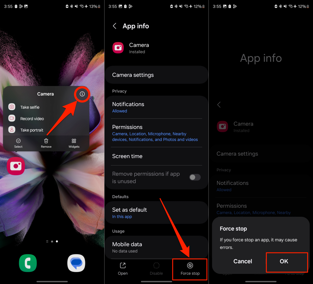在 Android 上,長按相機應用程序圖標,點擊信息圖標>強制停止,然後選擇好的在確認屏幕上。