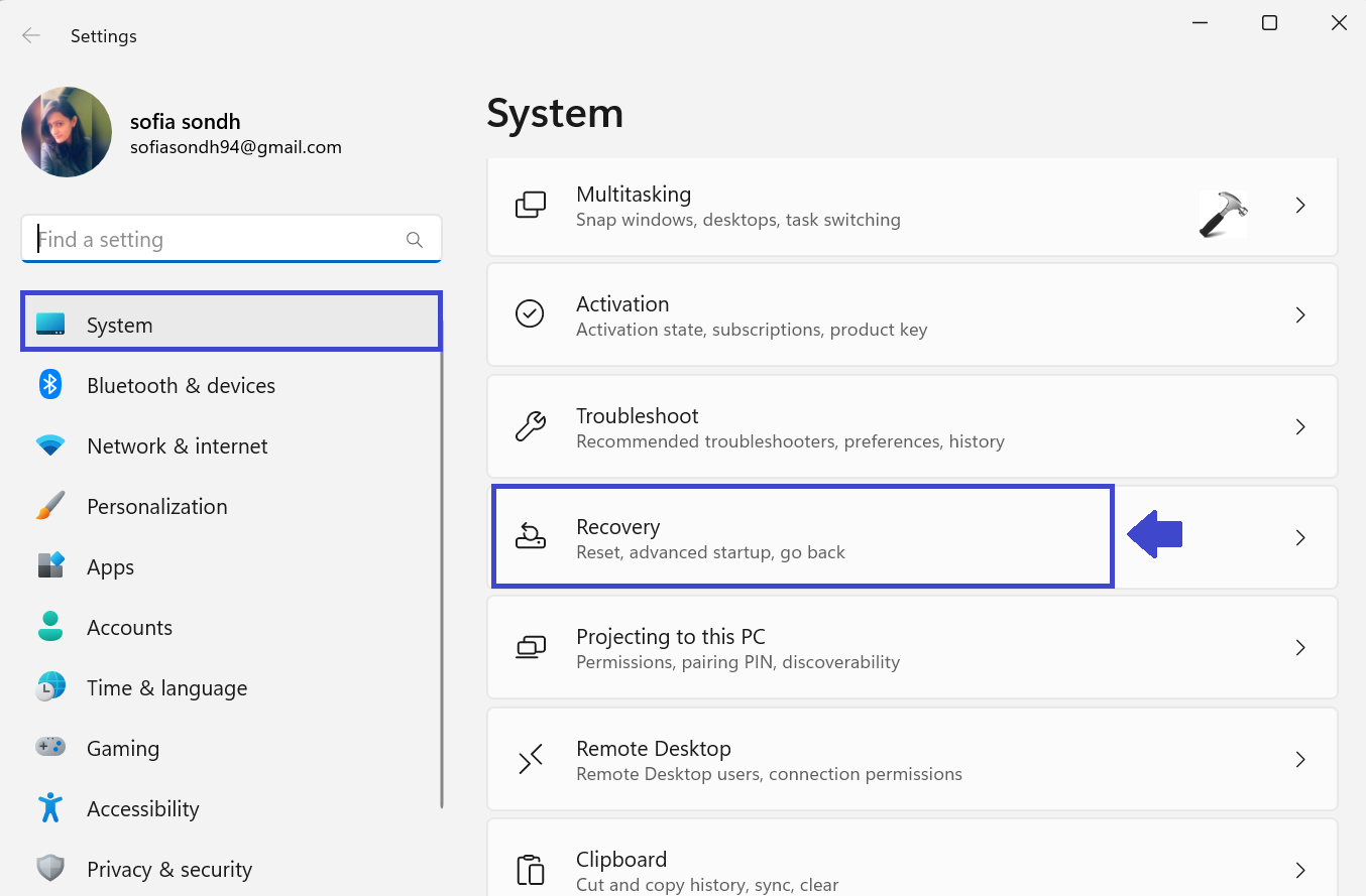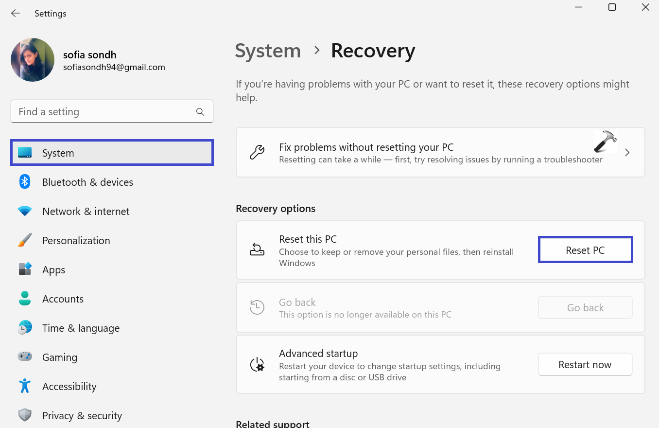 2. 在“恢復選項”部分,單擊“重置電腦“ 選項。