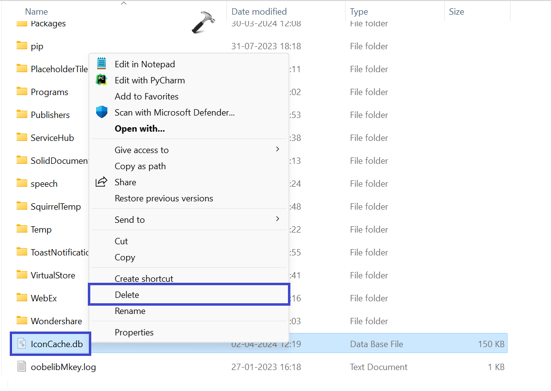 5. 在本地文件夾中,查找“圖標緩存” 文件。右鍵單擊它並選擇“刪除”。