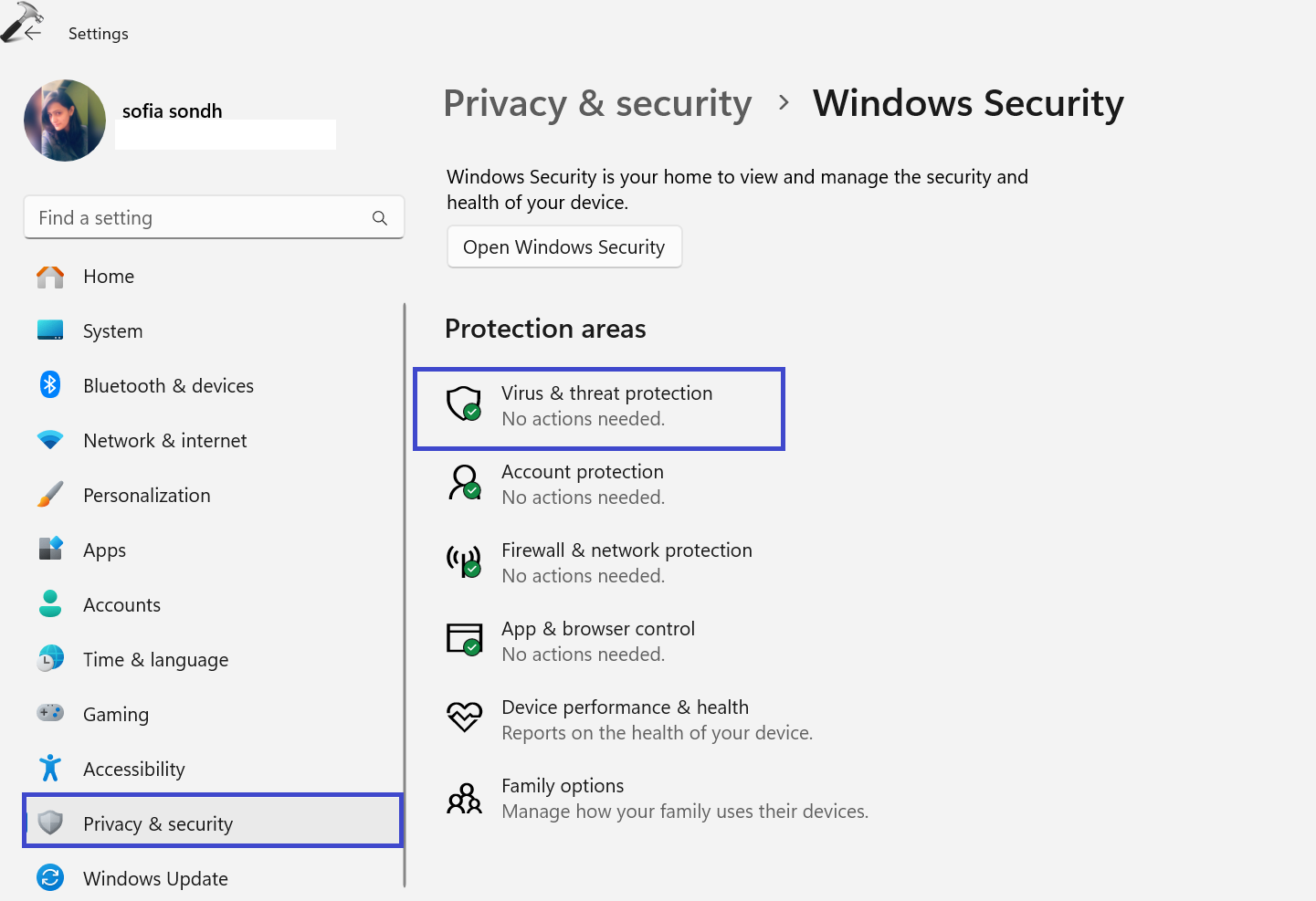 2. 現在,單擊“病毒和威脅防護“ 選項。