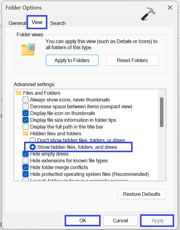 在下面進階設定,找到該選項顯示隱藏的文件、文件夾和驅動器。確保此選項旁邊有復選標記。