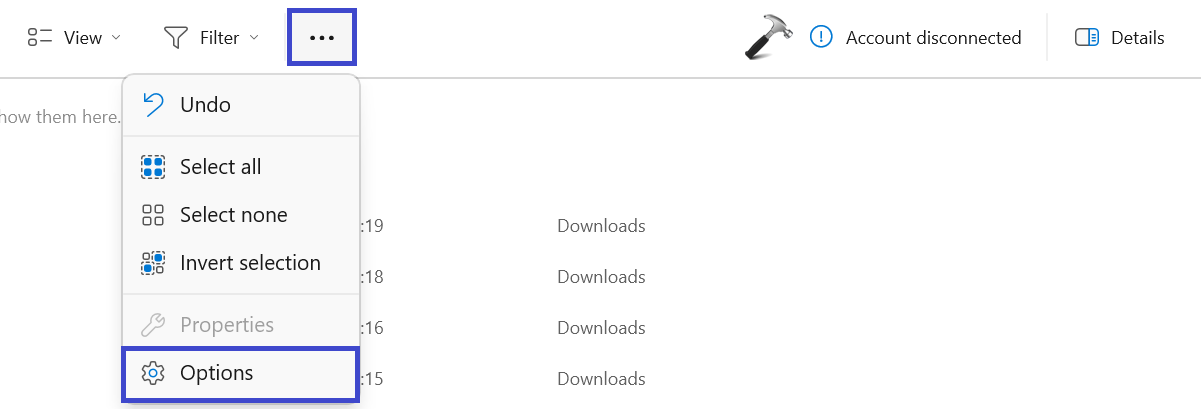 1. 打開文件資源管理器。單擊三個水平點 (...) 並選擇“選項”從菜單中。