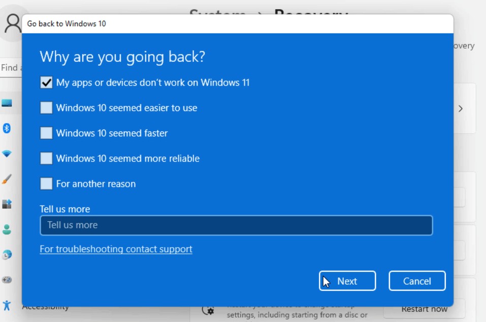 4.在下一個窗口中,選擇您想要移回 Windows 10 的原因,然後單擊下一個。