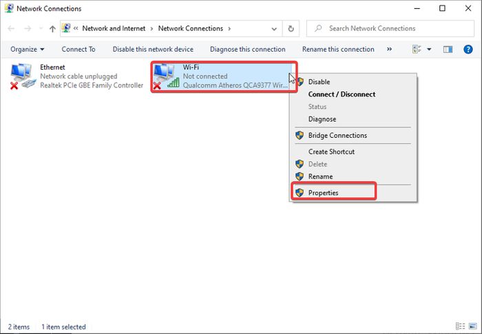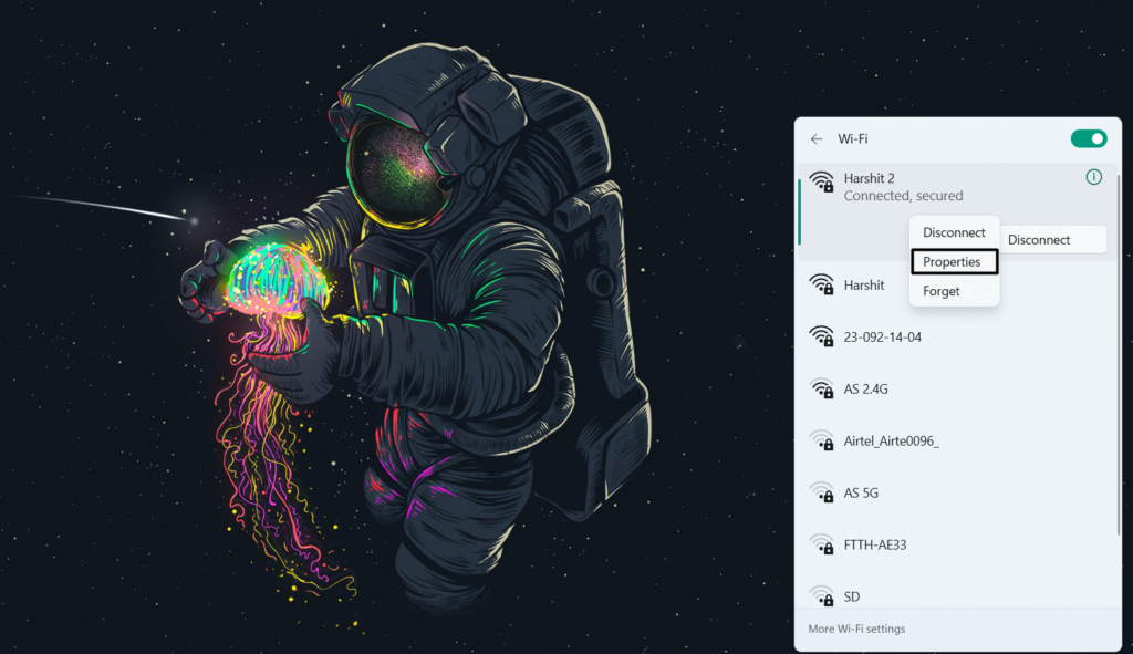 3.在下一個屏幕上,右鍵單擊您的 Wi-Fi 網絡並選擇特性從菜單中。