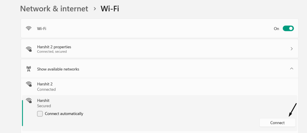 6.在同一部分下,再次搜索相同的 Wi-Fi 網絡,然後單擊連接在它旁邊。