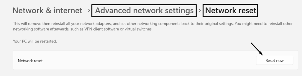 3.最後, 選擇網絡重置,然後單擊立即重置旁邊的按鈕網絡重置。