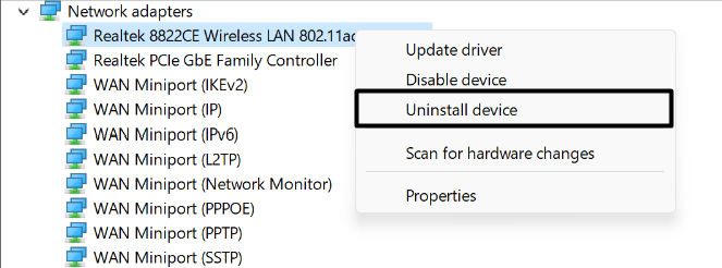 如果更新或恢復網絡適配器都無法解決問題,請考慮重新安裝它們。執行此操作將從電腦中刪除所有驅動程序數據,並有望解決此問題。因此,請嘗試此操作並檢查是否可以解決問題。您可以按照以下步驟操作: