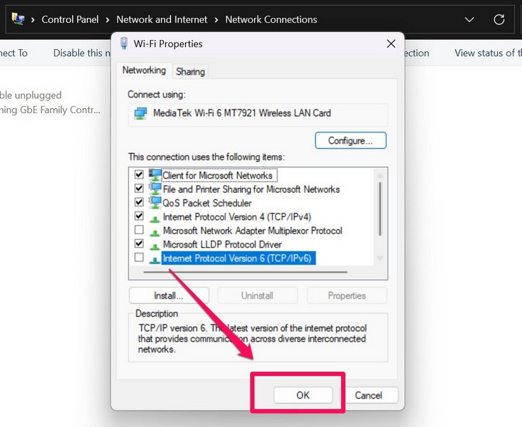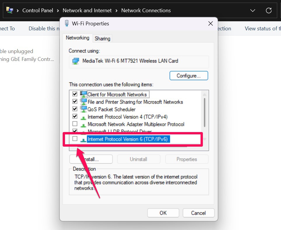 您可能不知道,實際上並不需要在 PC 上啟用 IPv6 選項才能讓 Wi-Fi 正常工作。但保持啟用有時會導致“無法連接到此網絡”錯誤。您的電腦上可能啟用了此功能,這就是出現此問題的原因。因此,我們建議您確保它已關閉嘗試以下步驟: