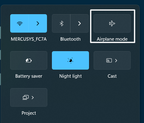 2.在快速操作中心,單擊飛行模式在您的 Windows 11 計算機上啟用它。
