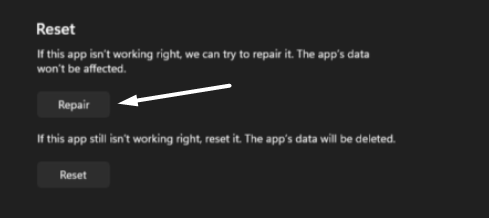5.應用程序重置後,單擊維修按鈕下的重置部分開始修復它。
