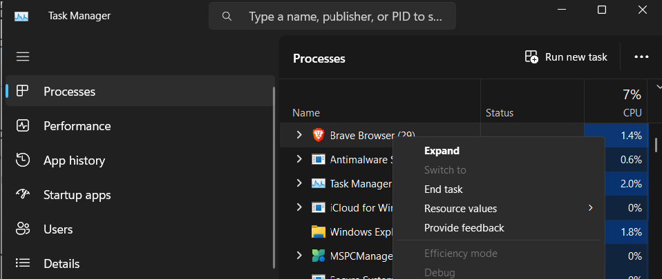 2.右鍵單擊其中的一個程序流程您當前未使用並想要強制關閉的部分。