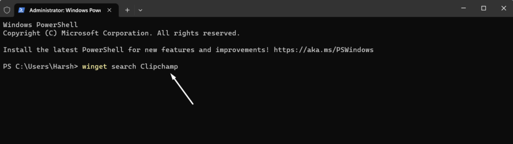 3.鍵入winget 搜索 Clipchamp在控制台中輸入命令並按進入來運行它。