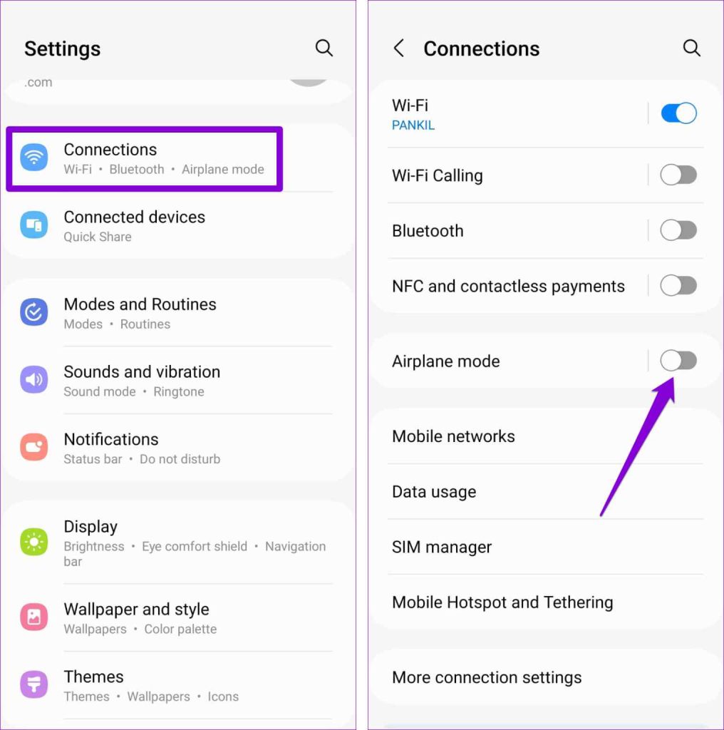 您可以通過打開和關閉飛行模式來刷新手機的網絡連接。如果僅因網絡問題而出現“連接問題或無效 MMI 代碼”錯誤,則切換飛行模式應該會有所幫助。步驟一: