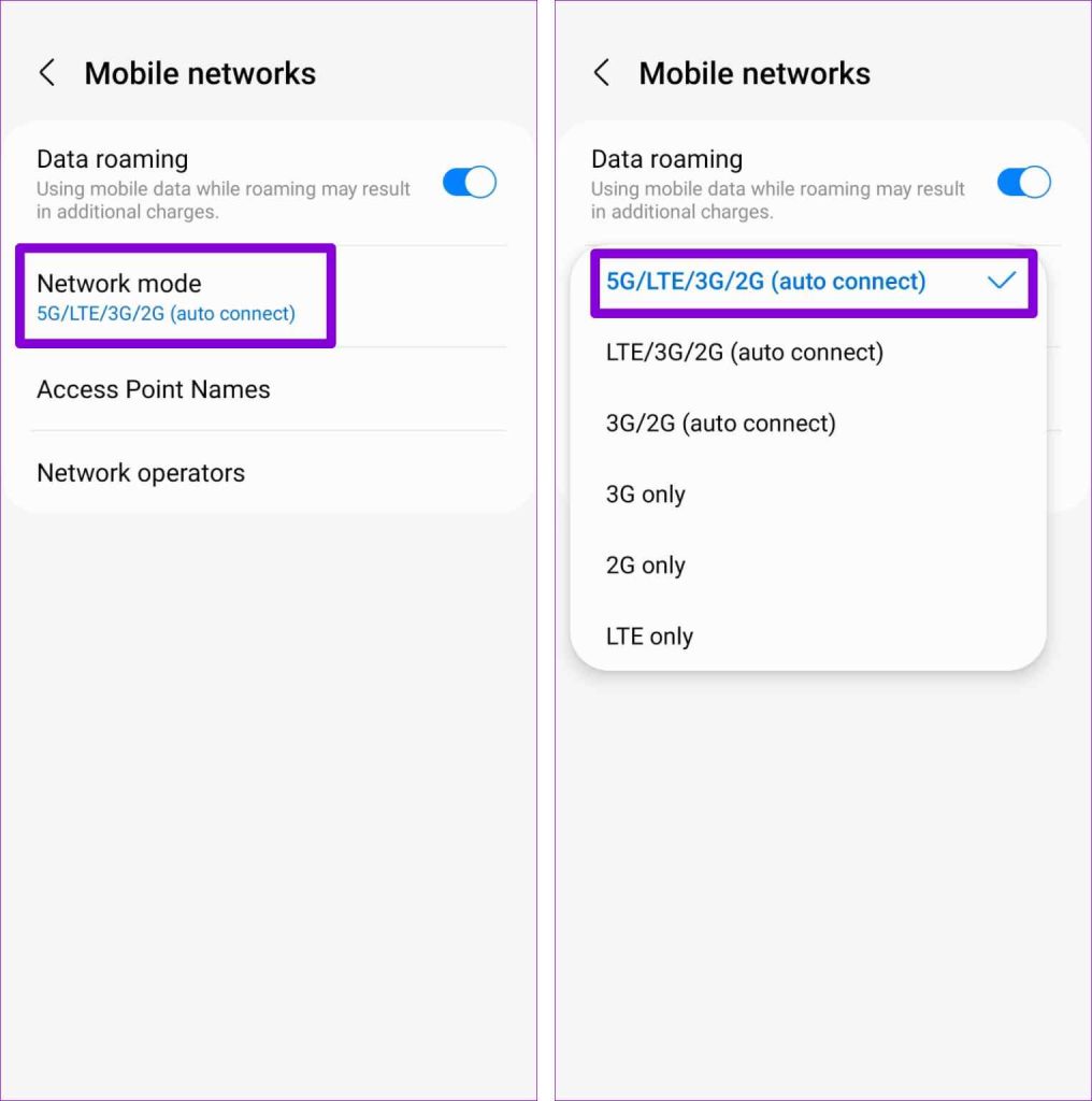 您需要點擊網絡模式選項並選擇 5G/LTE/3G/2G(自動連接)。第4步: