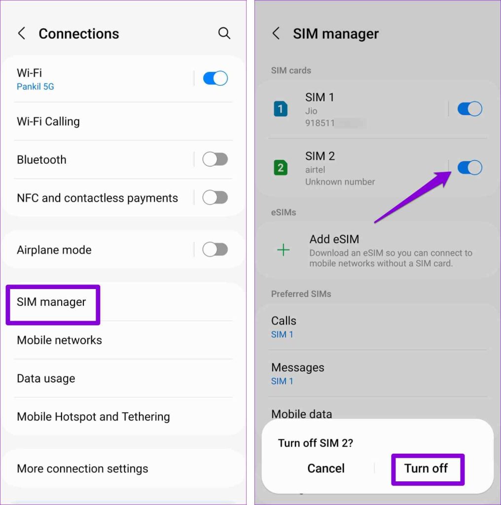 這些 MMI 代碼問題是支持兩張 SIM 卡的 Android 手機的典型問題。如果您遇到這種情況,請嘗試停用另一張 SIM 卡,看看這是否有助於結束“MMI 代碼啟動錯誤”。步驟一: