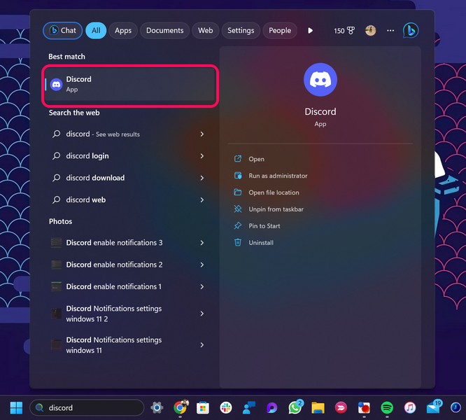 1.使用 Windows + S 打開 Windows 搜索並搜索 Discord 應用程序。