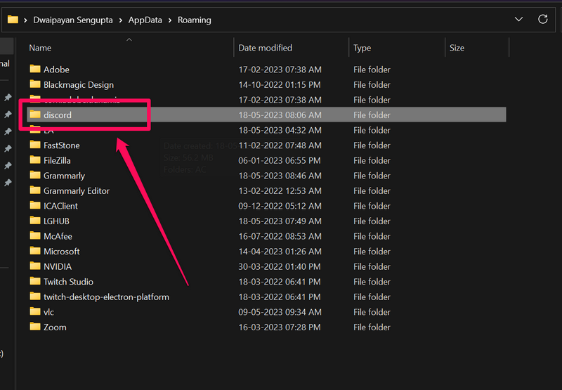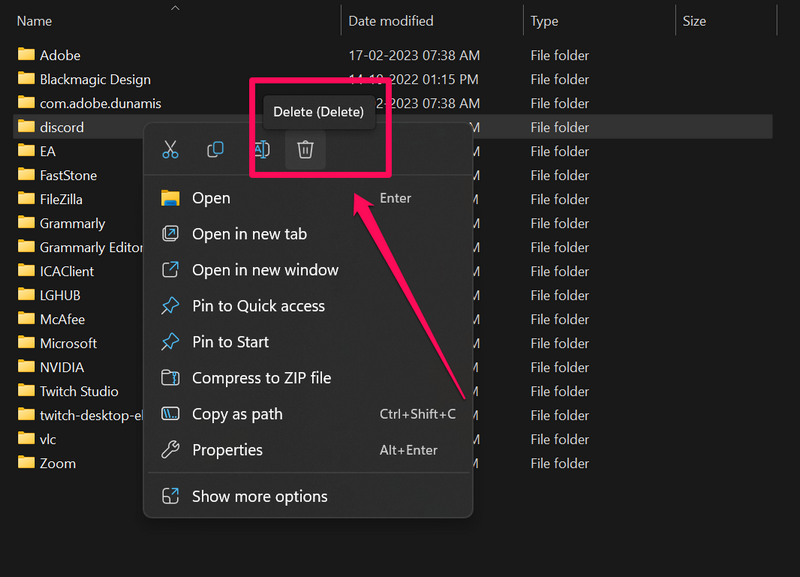 5.現在,您可以右鍵單擊不和諧文件夾並點擊刪除按鈕或選擇所述文件夾並按鍵盤上的 Del 按鈕。