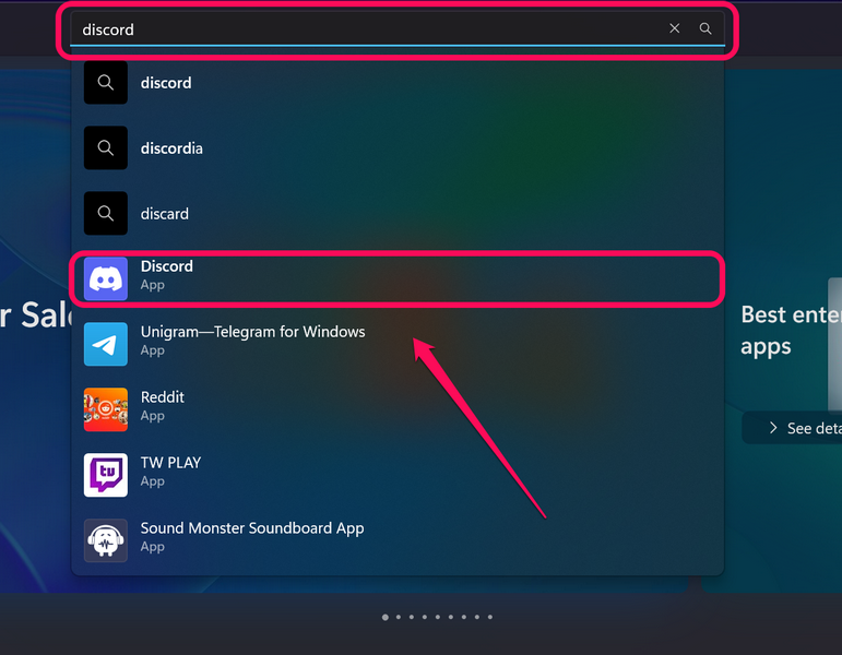 5.使用上面的搜索欄找到Discord應用程序和從搜索結果中選擇它下拉式選單.