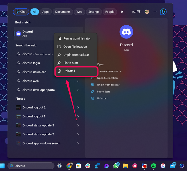 快速重新安裝 Discord 應用程序很有可能會解決平台上的搜索問題。因此,請按照以下步驟在 Windows 11 電腦或筆記本電腦上重新安裝 Discord 應用程序:
