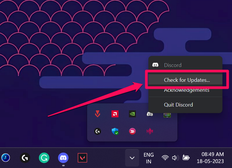 接下來是在 Windows 11 中更新 Discord 應用程序的第二種方法,即通過 Windows 任務欄上的系統托盤。