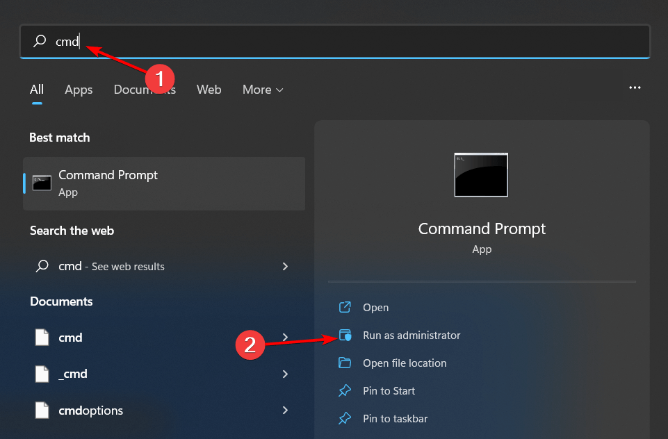 步驟2:第一個結果是最佳匹配下的命令提示符。單擊以管理員身份運行選項。