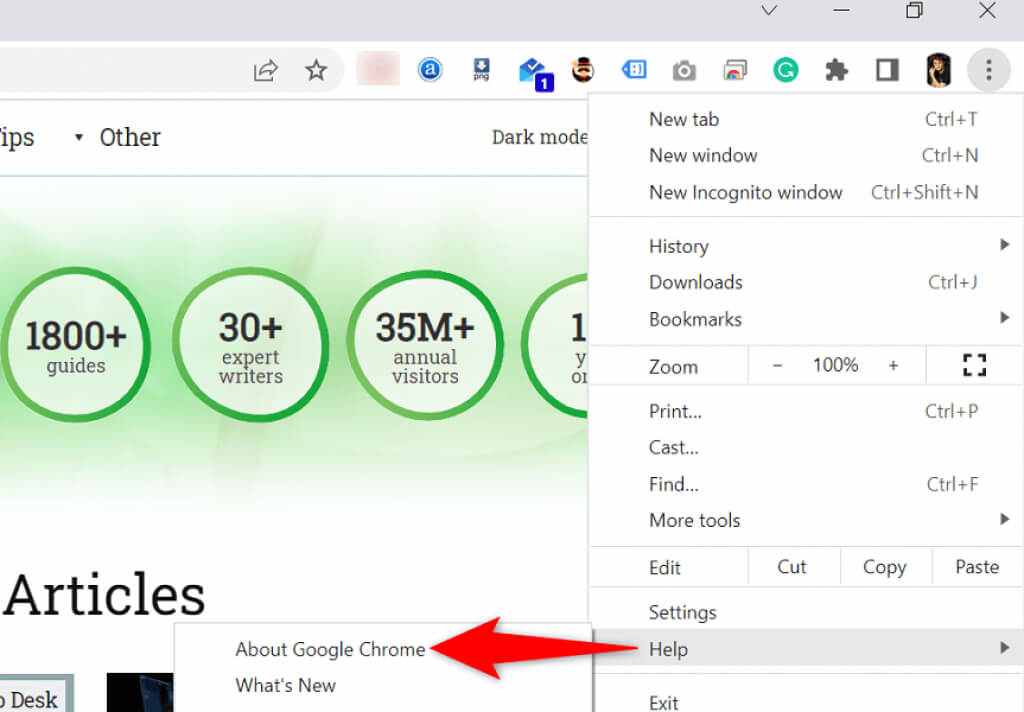 - 發射鉻合金,選擇右上角的三個點,然後選擇幫助>關於谷歌瀏覽器。