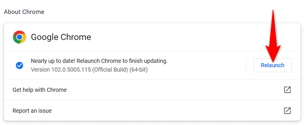 更新瀏覽器是解決此類問題的最佳方法。 Google 經常向 Chrome 推送錯誤修復和其他改進,安裝這些更新可以解決瀏覽器的許多問題。