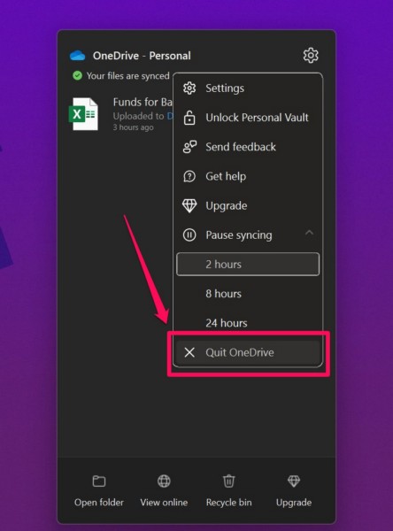 重新啟動後,等待 OneDrive 應用程序啟動,然後單擊任務欄或系統托盤上的應用程序圖標將其打開。在應用程序中,檢查您的設備上是否仍然遇到“雲文件提供程序未運行”錯誤 0x8007016A。