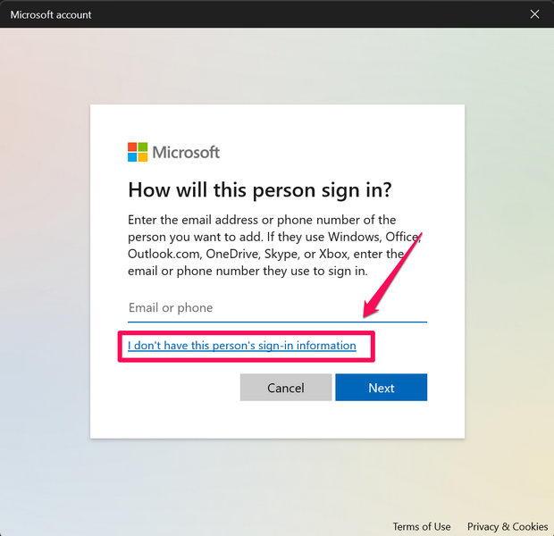4.在接下來的窗口中,選擇我沒有此人的登錄信息按鈕。