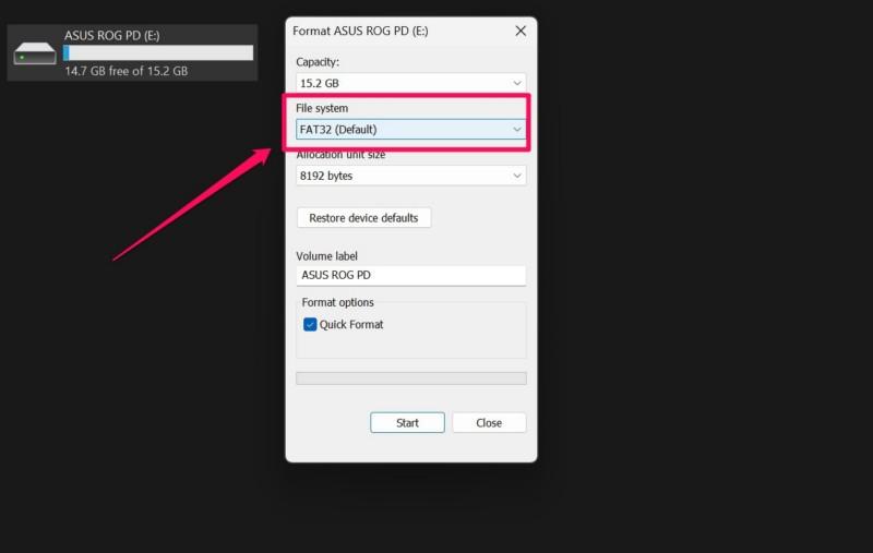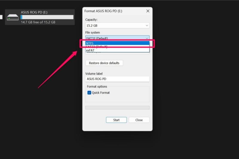 要解決 Windows 11 電腦或筆記本電腦上的“錯誤 0x800701B1:指定了不存在的設備”,您可以採取的另一件事是更改外部驅動器的文件系統。它適用於許多用戶,但更改外部驅動器的文件系統將需要您對其進行格式化。這意味著存儲在外部驅動器中的所有數據都將被永久刪除。