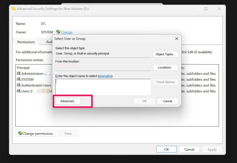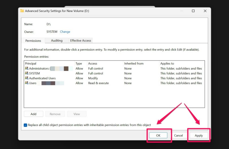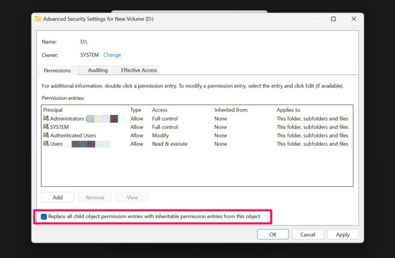 8.最後,在外部驅動器的高級安全設置窗口中,檢查將所有子對象權限條目替換為此對象的可繼承權限條目選項。