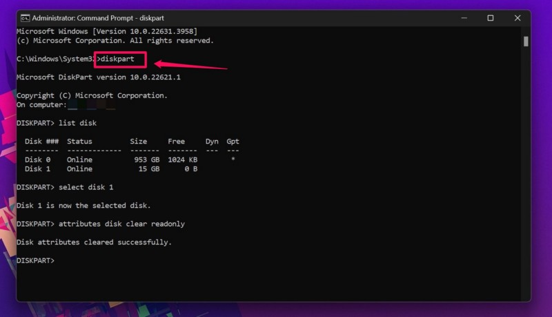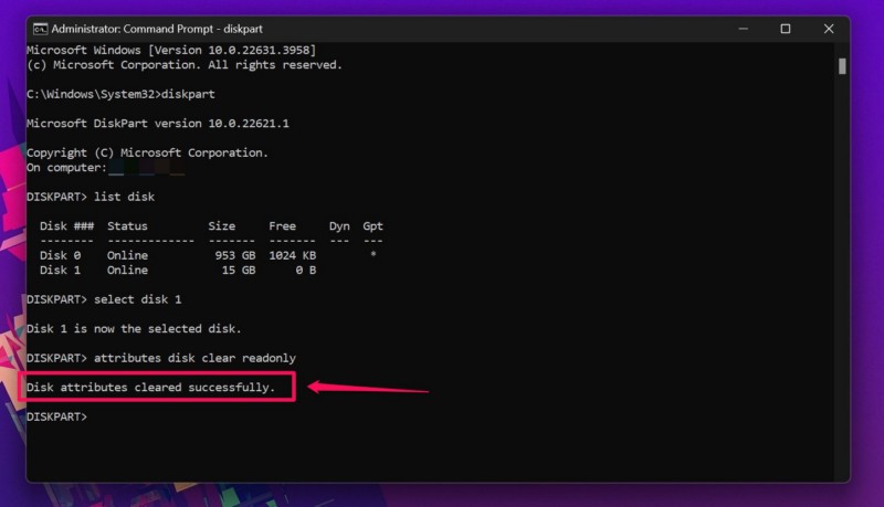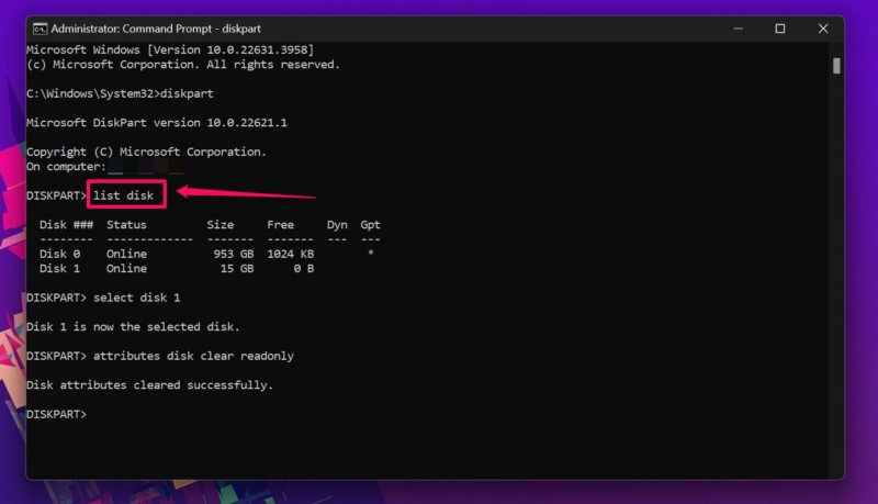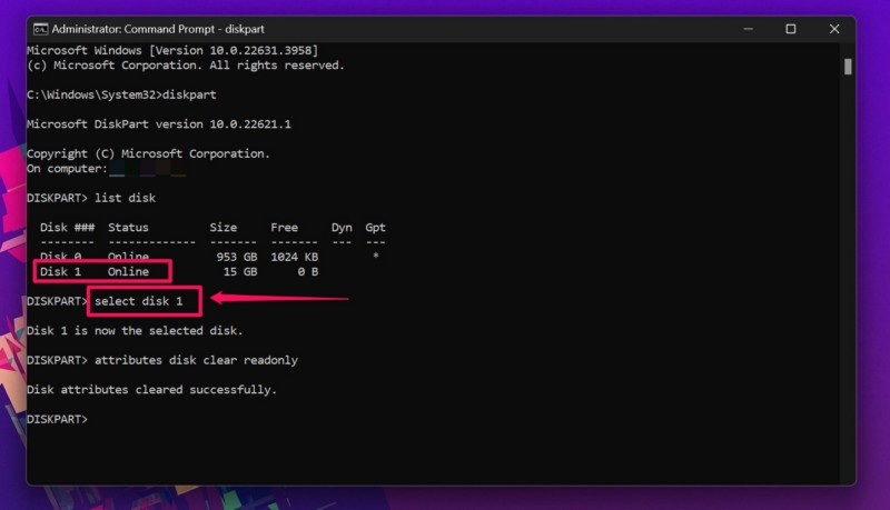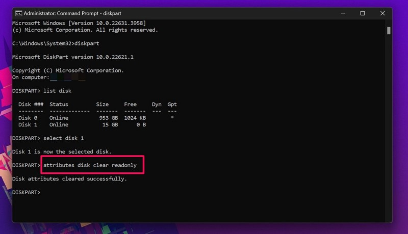 7.在 DiskPart 中選擇外部磁盤驅動器後,輸入以下命令然後按 Enter 鍵禁用只讀格式對於它: