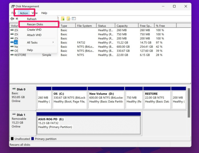 9. 在 Windows 11 中使用磁盤管理重新掃描外部驅動器