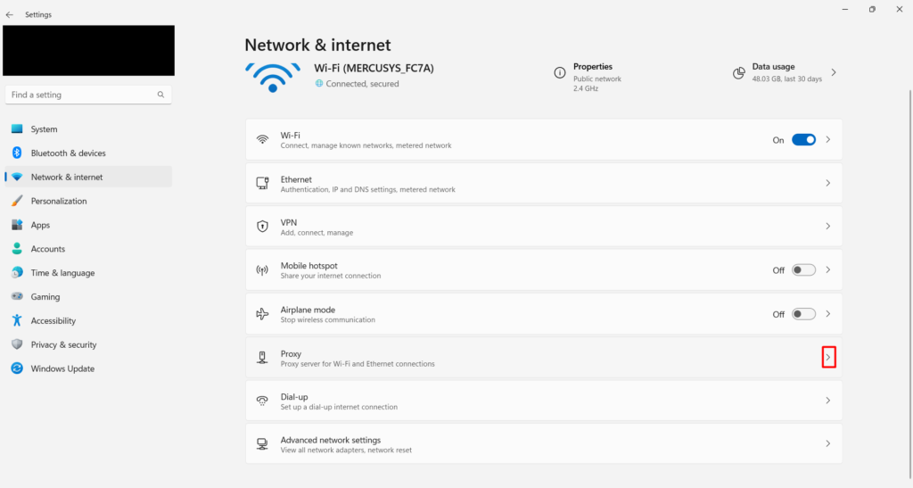 1.使用 Windows + I 熱鍵打開設置應用程序,然後從左側選擇網絡與互聯網。