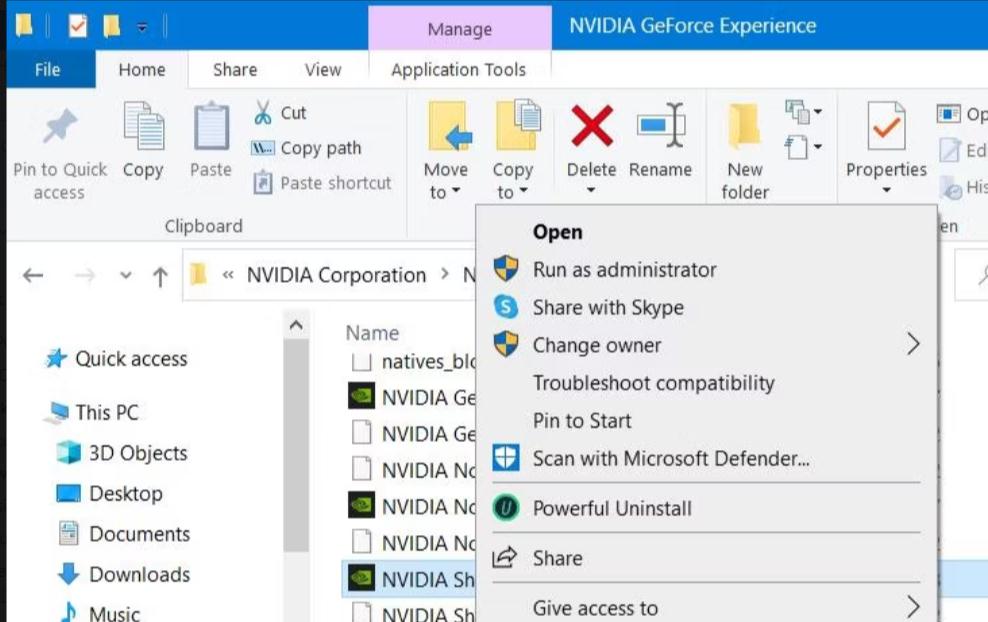 第7步:現在,導航到英偉達再次文件夾,右鍵單擊NVIDIA共享.exe,並選擇以管理員身份運行。