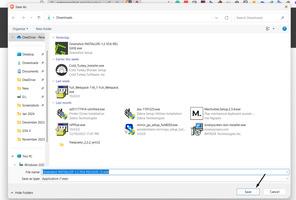 4.在另存為窗口,選擇節省將 Greenshot 可執行文件下載到設備上。