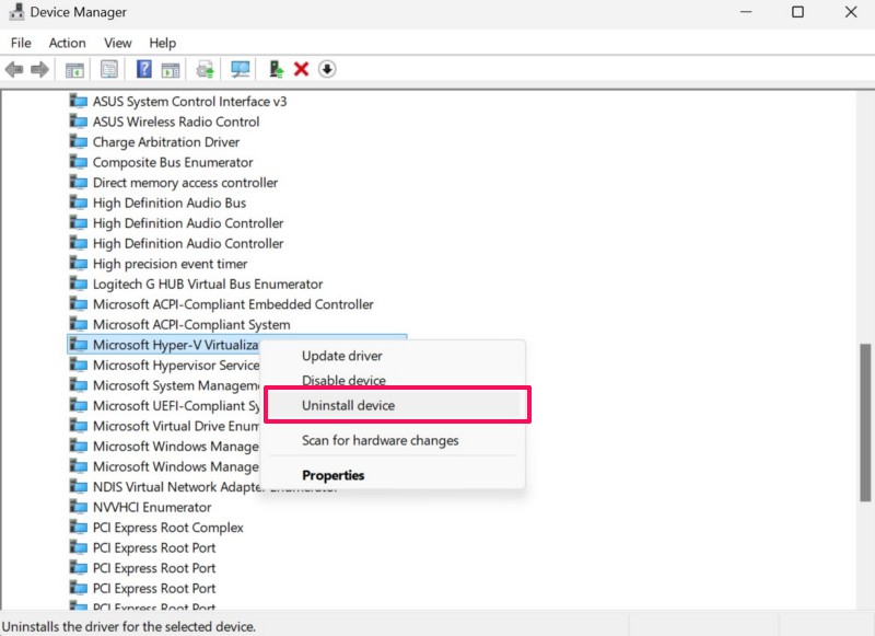 2. 右鍵單擊於Microsoft Hyper-V 虛擬化基礎架構驅動程序選項並點擊卸載選項在上下文菜單上。