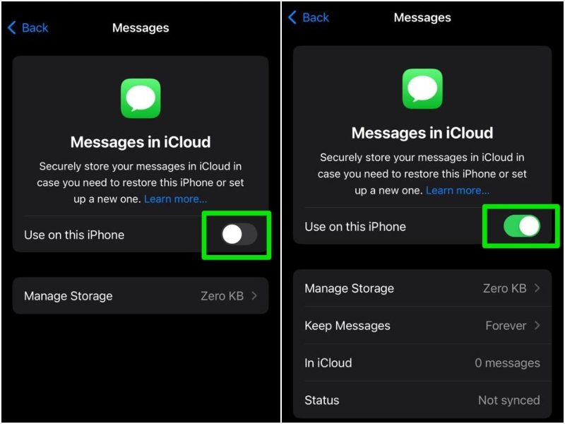 基本上就是這樣!這將為 iPhone 上的消息應用程序啟用 iCloud 同步。只要您的 iPhone 電量充足並連接到活動的互聯網網絡,iCloud 就會自動在其他 Apple 設備上同步當前 iPhone 的所有消息,並允許您在任何設備上訪問它們。