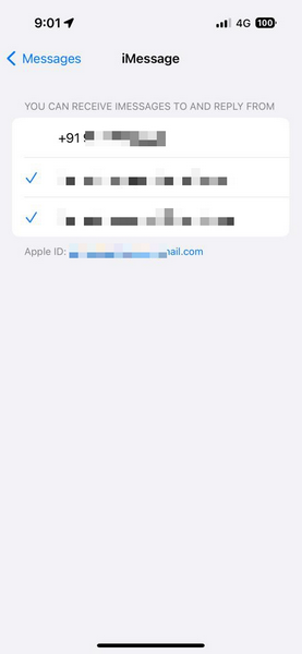 6.在下一頁中,您將查找電話號碼和電子郵件 ID 的列表可用於在 iPhone 上使用 iMessage 發送和接收消息。