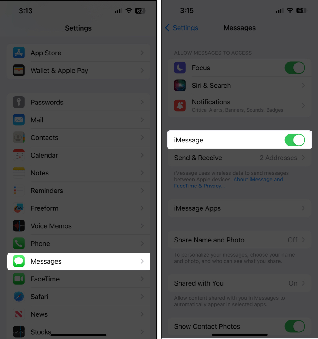 也就是說,如果 iMessage 沒有打開,您的 iPhone 將無法接收或發送圖片。要打開 iMessage,請轉至設定→ 向下滾動至留言→ 開啟簡訊。另外,點擊發送和接收並選擇要在消息中使用的號碼。