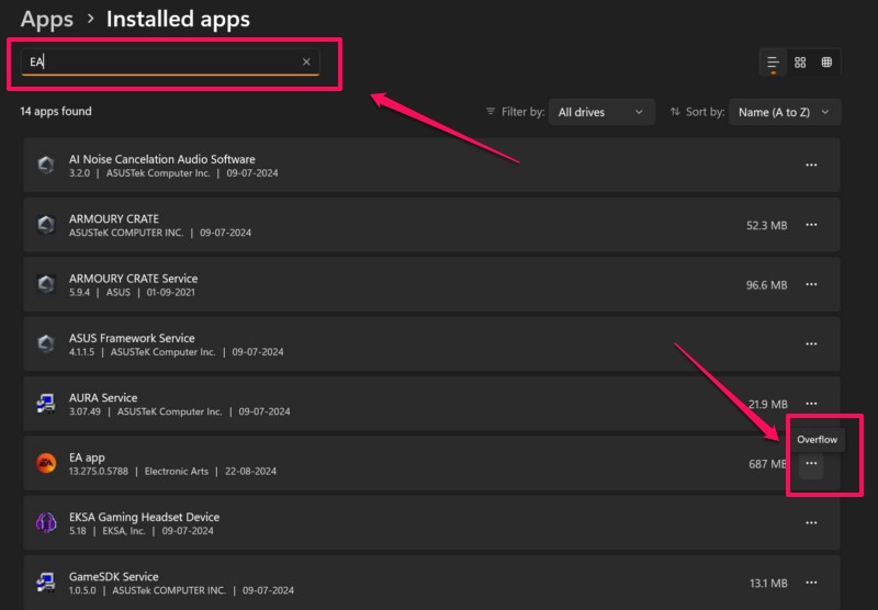3.使用搜索欄上方找到生成“LoadLibrary 失敗,錯誤 87:參數不正確”錯誤的應用程序,然後單擊溢出 (…) 按鈕在它旁邊。