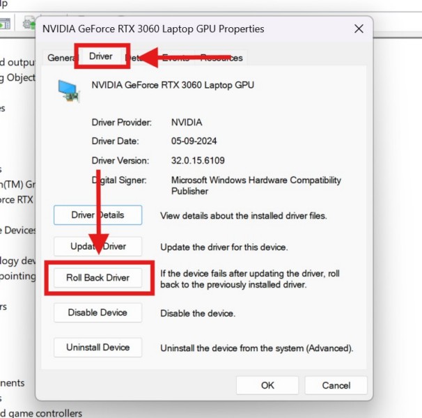 現在,如果您在 Windows 11 電腦或筆記本電腦上最近更新顯卡驅動程序後開始遇到“LoadLibrary 失敗,錯誤 87:參數不正確”錯誤,您可以嘗試回滾到以前的版本。您會看到,圖形驅動程序更新有時可能包含技術錯誤或故障,可能會為某些設備生成錯誤。在這種情況下,最好繼續使用舊版本的圖形驅動程序,直到製造商發布較新的驅動程序更新,並且不存在可能觸發錯誤(例如“LoadLibrary 失敗,錯誤 87:參數不正確”)的錯誤。