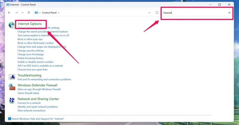 3.現在,使用控制面板中的搜索欄找到互聯網選項並單擊所述選項。