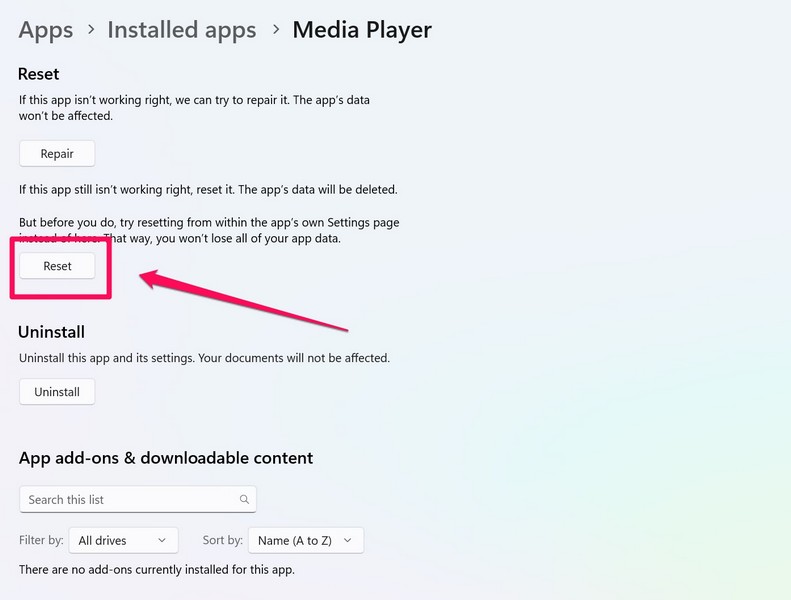 接下來,您可以嘗試修復或重置 Windows 11 中的媒體播放器,以嘗試解決您的 PC 或筆記本電腦上的媒體播放器無法工作的問題。您可以在 Windows 設置中媒體播放器應用程序的高級選項頁面中找到上述選項。請按照以下步驟修復和/或重置 Windows 11 中的媒體播放器應用程序: