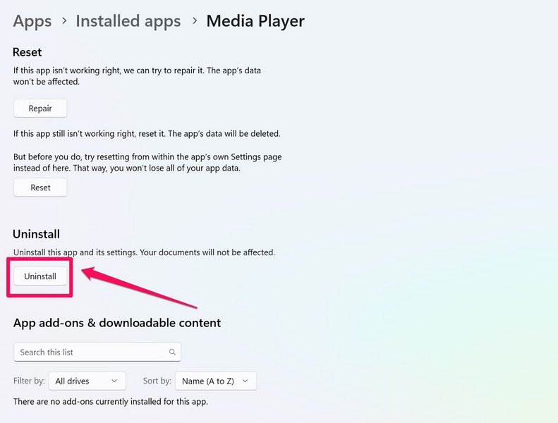 如果更新媒體播放器應用程序未能解決 Windows 11 電腦或筆記本電腦上的問題,那麼最好的辦法就是重新安裝該應用程序。卸載設備上的媒體播放器應用程序並重新安裝可能有助於解決媒體播放器在 Windows 11 中無法工作的問題。因此,請按照下面的步驟進行操作。