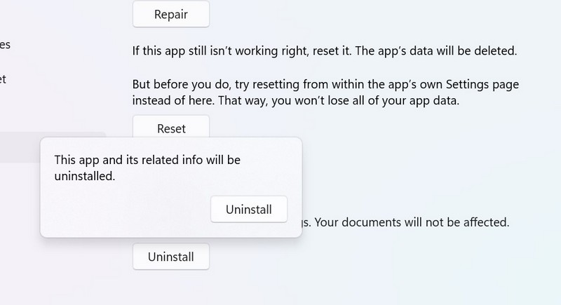 9.如果修復應用程序未能解決問題,請單擊重置按鈕在高級選項頁面上。