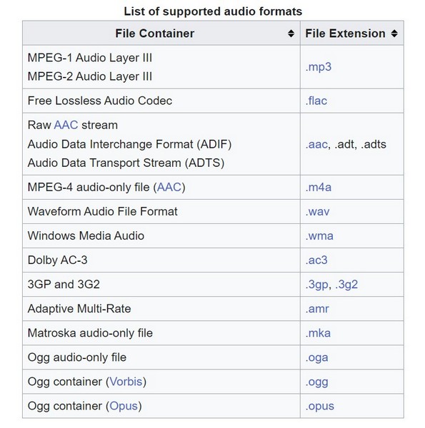 查看下圖了解 Windows Media Player 支持的所有音頻文件格式。