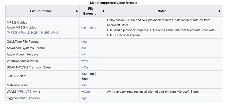 Windows Media Player 支持的視頻文件格式可以在下面的屏幕截圖中找到。