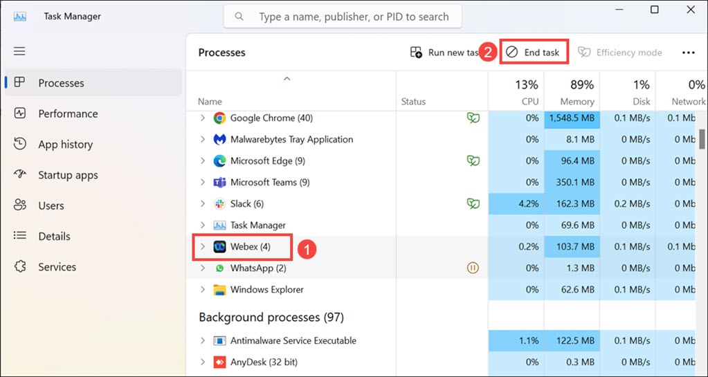 有時,Cisco Webex 可能會遇到臨時問題,可以通過從任務管理器重新啟動應用程序來解決這些問題。