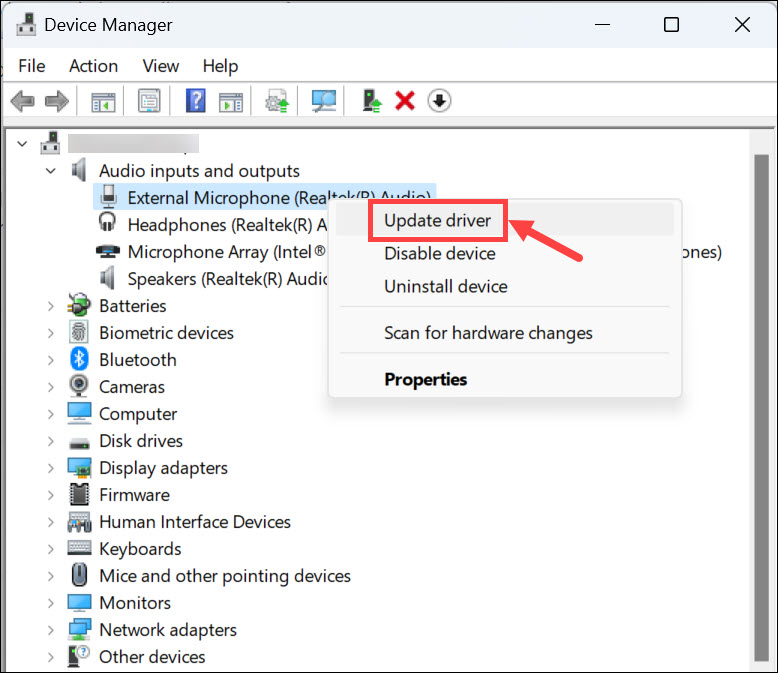 3.右鍵單擊您的麥克風並選擇更新驅動程序。
